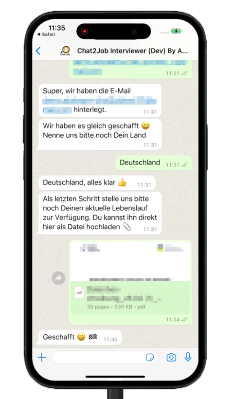 - Integrierte Chatbot-Funktion mit WhatsApp-Anbindung oder Nutzung eines anderen bevorzugten Messengers – für eine direkte und dialogbasierte Kommunikation mit Beteiligten im Personalauswahlprozess.