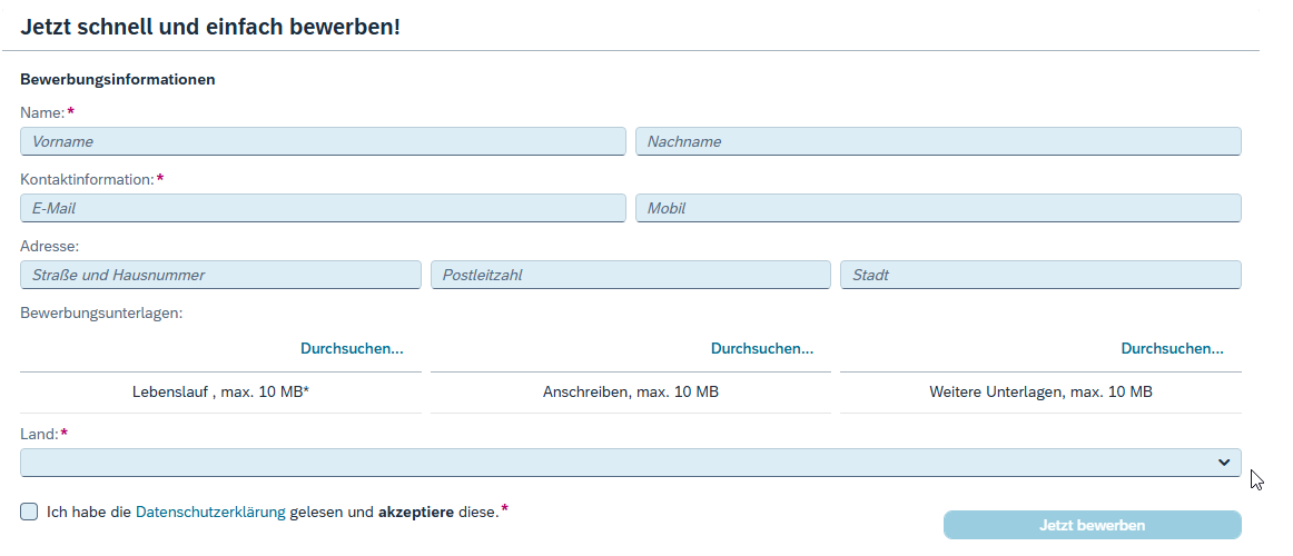 - Bewerbung ohne Benutzerkonto: Ermöglichen Sie externen Bewerbenden eine Bewerbung in wenigen Klicks und ohne Registrierung, direkt eingebettet als Online-Formular in Ihre Karriereseite oder Corporate Homepage und leicht anpassbar auf das Corporate Design Ihres Unternehmens.