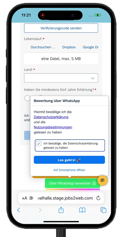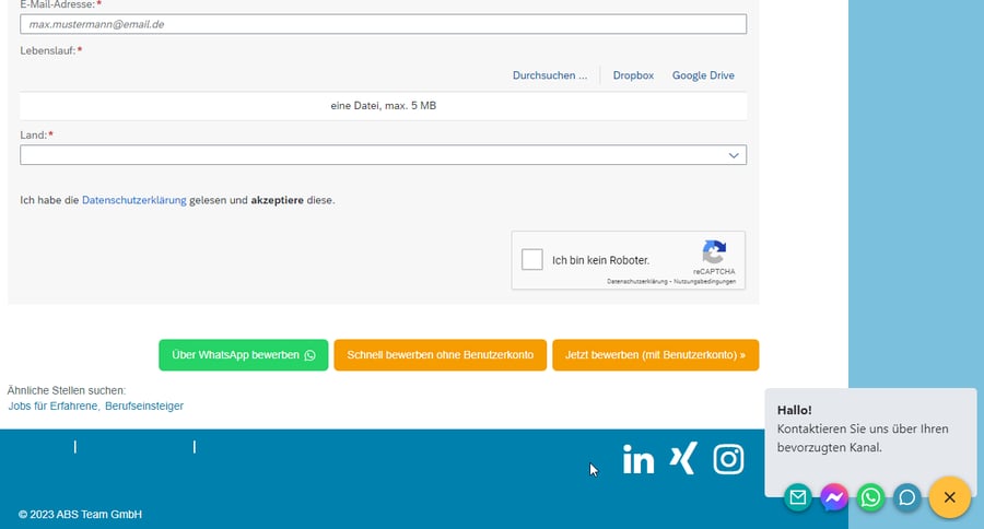 Für diesen innovativen und effizienten Weg liefert ABS Team mit Chat2Job die passende Lösung: Sie erweitert das bewährte Tool Apply in Minutes für Schnellbewerbungen um einen Chatbot für jede gewünschte Messenger-App. Mit Chat2Job können Kandidatinnen und Kandidaten ihre komplette Bewerbung mit allen Anlagen zum Beispiel direkt per WhatsApp senden. Alle Daten aus den WhatsApp-Dokumenten werden automatisiert und KI-gestützt ausgelesen und mit den Kriterien Ihres SAP SuccessFactors Recruiting-Systems abgeglichen. Neben WhatsApp integriert Chat2Job auch sämtliche gängigen Messengerdienste in das Mobile-Recruiting Ihres Unternehmens – selbstverständlich Plattform-übergreifend.