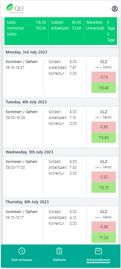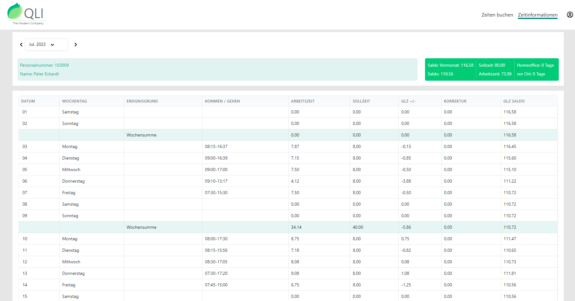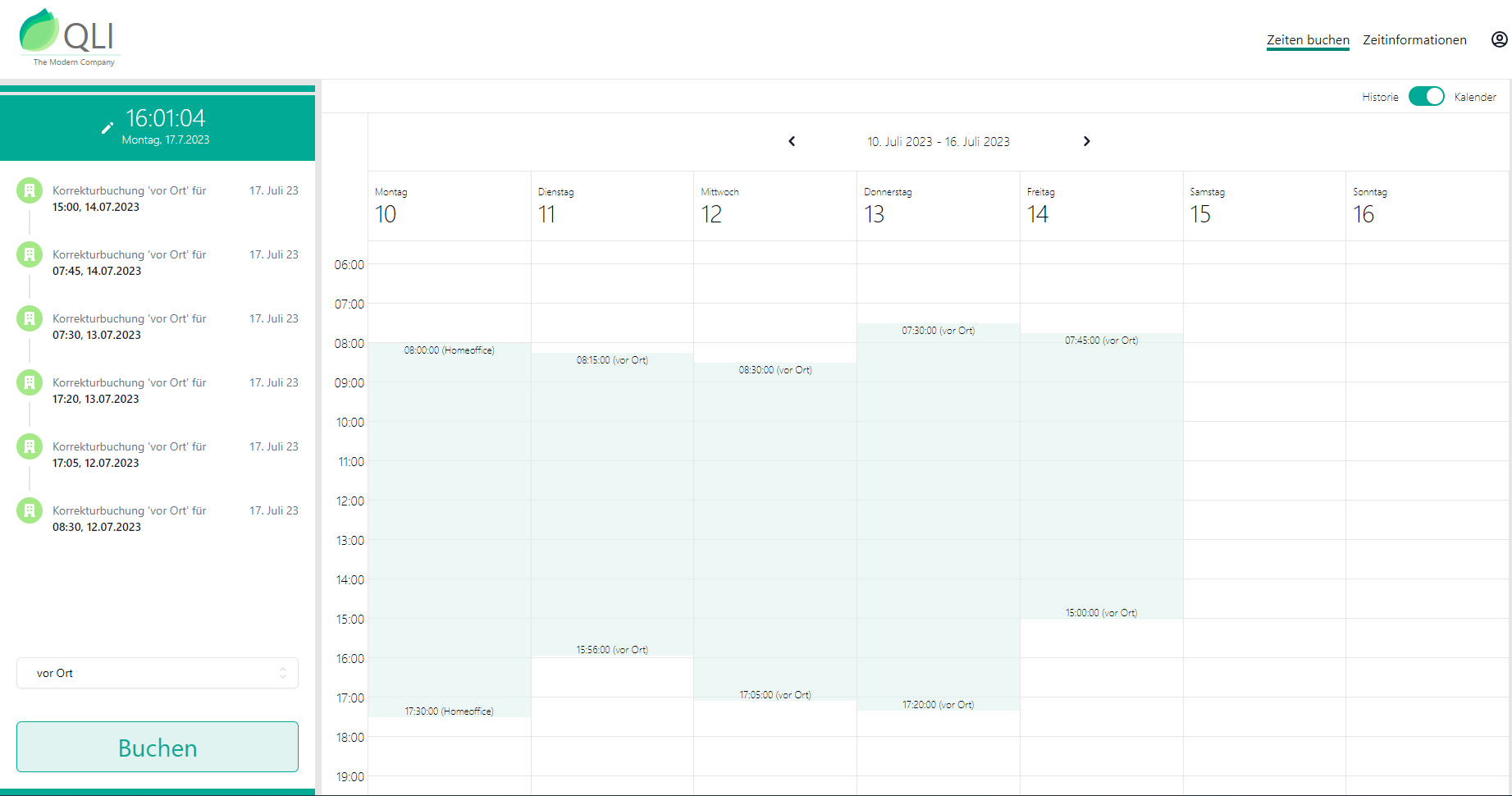 - Darstellung der vorhandenen Zeitbuchungen als Kalender oder als Liste möglich.