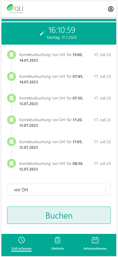 - Erfassen von Zeitbuchungen wie Kommen/Gehen, Homeoffice und Reisezeit